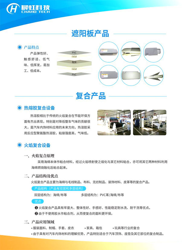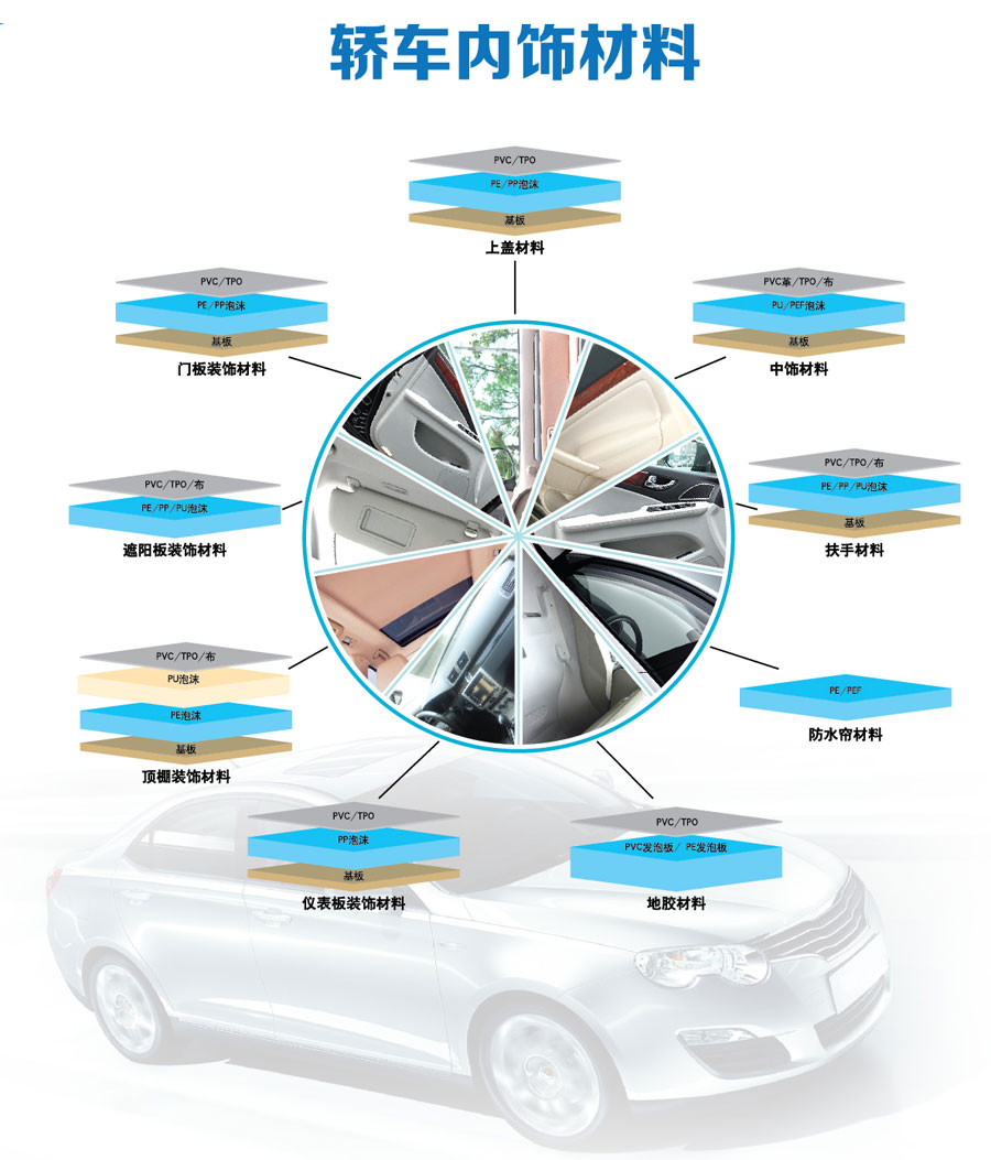 轎車內(nèi)飾材料、客車內(nèi)飾材料、火焰復(fù)合產(chǎn)品、PVC膜/PVC革產(chǎn)品、模壓發(fā)泡產(chǎn)品……